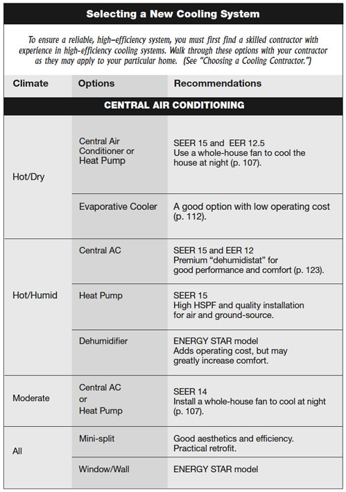 For central air conditioners and air-source heat pumps, look for a SEER of at least 15. Besides SEER, there are two other factors to check. The first is high-temperature performance. Although it is not federally mandated, EER at 95°F is available. Look for at least EER 11.6. If this is a replacement for an existing system, it is critical to replace both the condensing (outdoor) unit and the evaporator (indoor “coil”). In general, the old “coil” will have used a different refrigerant, be too small, and have the wrong control device. When shopping for room air conditioners, look for EER ratings of 11 or higher, if available.