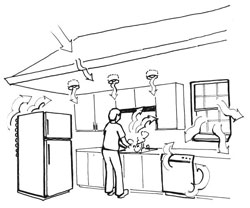 Get Rid of Inefficient Appliances. Lighting, refrigerators, stoves, washers and dryers, dishwashers, and other household appliances are all sources of waste heat, raising the interior temperature of your house. The best solution is to buy energy-efficient products. Energy-efficient appliances and lights produce far less waste heat. Standard incandescent light bulbs, for example, emit 90% of their energy as heat — only 10% as light. Compact fluorescent lights, on the other hand, produce only a fraction of the heat (see Lighting). In some cases, you can delay heat-producing tasks, such as dishwashing, until the cooler evening hours. You might also consider relocating a freezer to the basement or garage, where it won’t contribute its waste heat to your living space. And by planning your meals carefully, you can minimize use of the oven on the hottest days.
